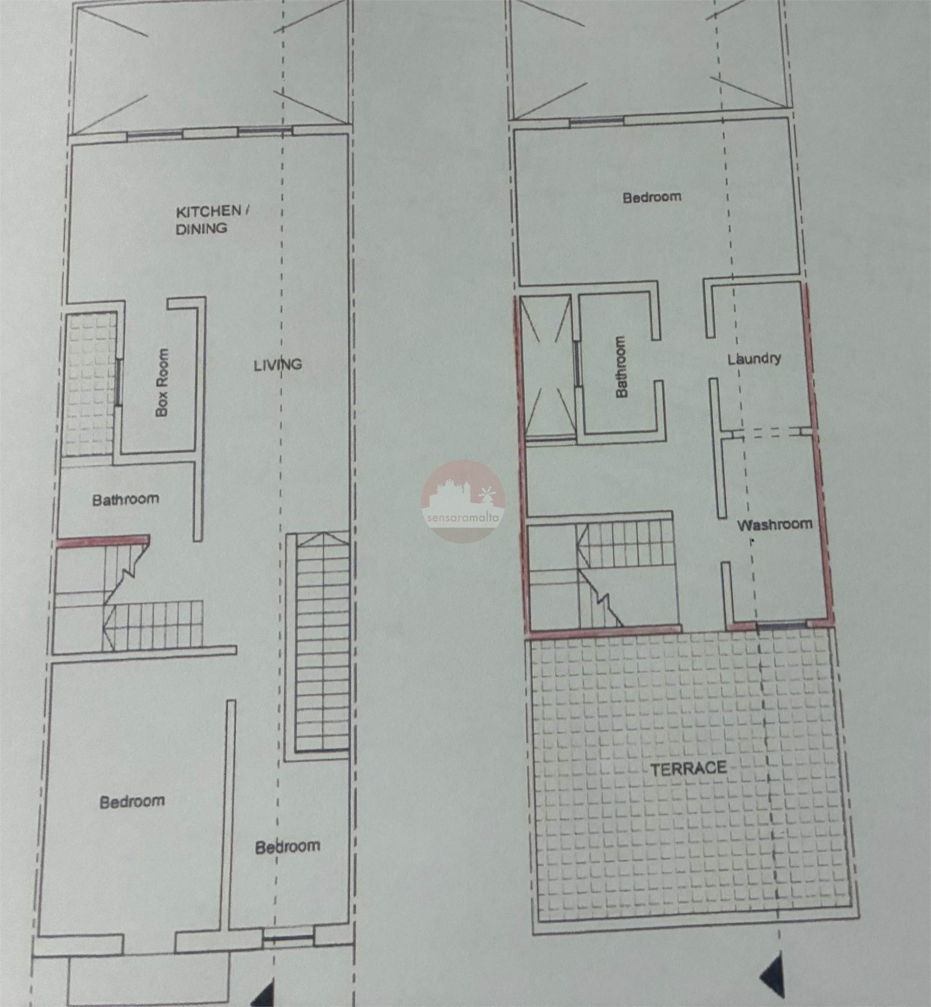 A stairway leads to a living/kitchen/dining, box room, bathroom, two bedrooms. On the second floor one finds a third bedroom, laundry, washroom, bathroom and terrace.