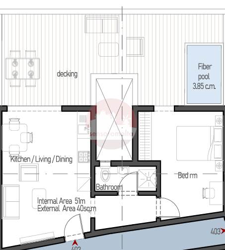 Fgura 1-bedroom penthouse on plan facing ODZ, featuring an open-plan kitchen, dining, and living area, a main bedroom, and a bathroom. This property boasts a spacious and large terrace with pool, ideal for outdoor living and entertaining. This Penthouse will be sold in shell form with all common parts ready and is estimate to be ready by end of 2027. Optional garages are available at an extra price.