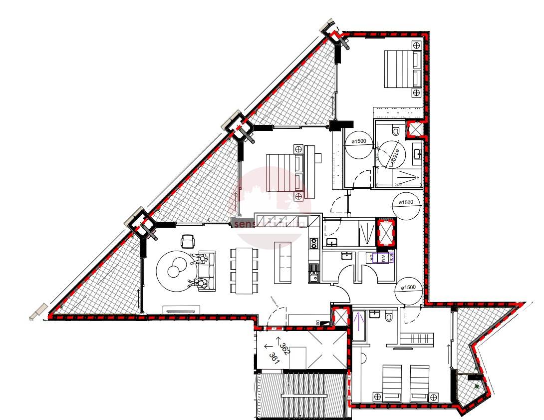 Consists of three-bedrooms, all of them with their own ensuite bathroom, a laundry room, and a main bathroom. The open-plan kitchen, dining, and living area creates a spacious layout, while every room enjoys direct access to a balcony.