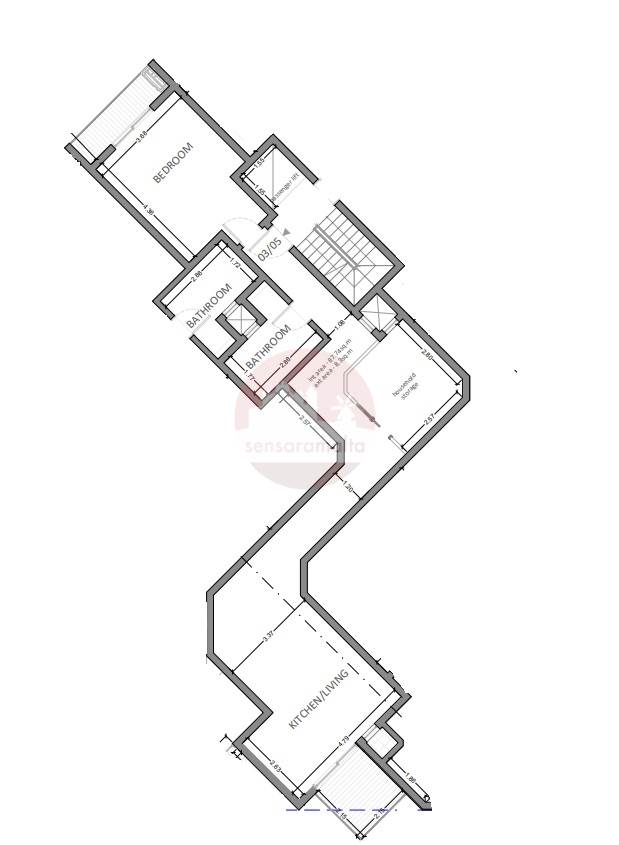 The layout consists of an open plan kitchen/dining/living with a front terrace, main bathroom and a double bedroom with a balcony.