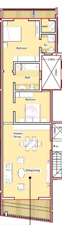 The layout comprises of an open plan kitchen/dining/living with a front terrace, main bathroom, a wash room, and two-double bedrooms. The master bedroom includes an ensuite bathroom and is connected to a balcony.