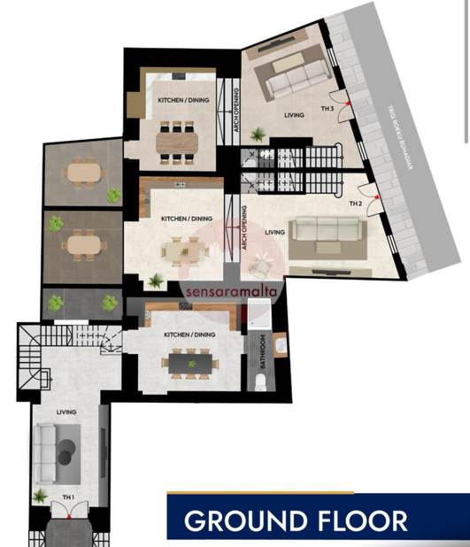 Property consists of a living area followed by a kitchen/dining room, main bathroom and backyard. First floor consists of 3 double bedrooms, 2 of which enjoy a separate terrace and main comes with en- suite. Highest level consists of a washroom leading to its roof terrace, enjoying full ownership of airspace.