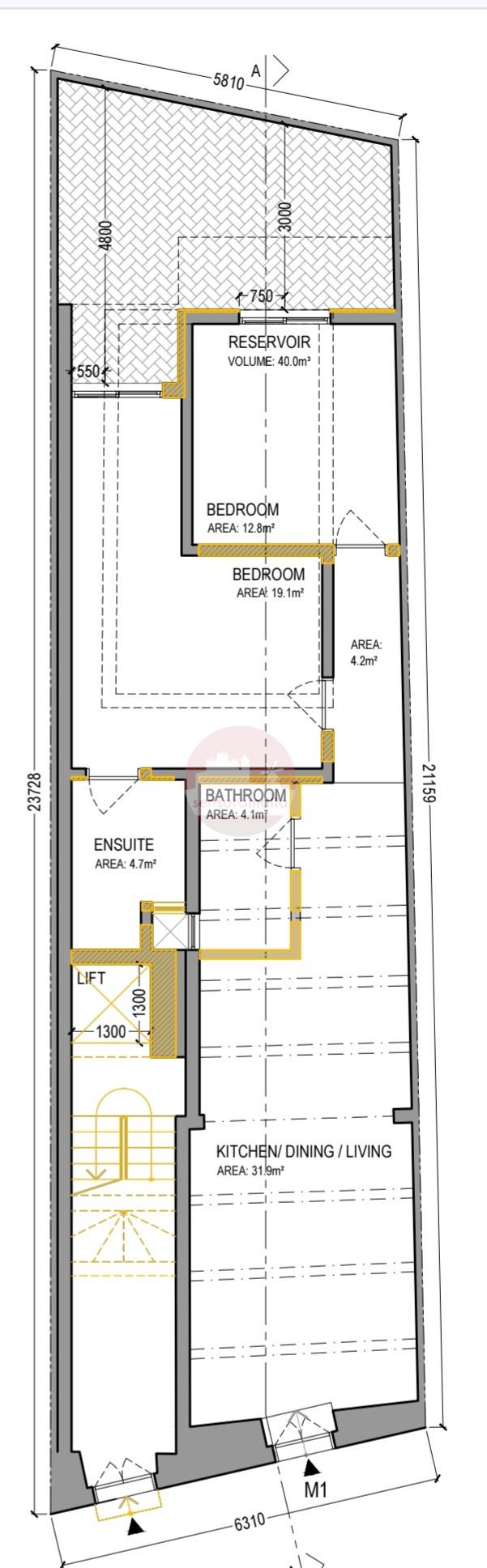 The layout includes an open-plan kitchen/dining/living area, main bathroom, master bedroom with an ensuite, second double bedroom and a spacious backyard of circa 22sqm, making it ideal for entertaining.