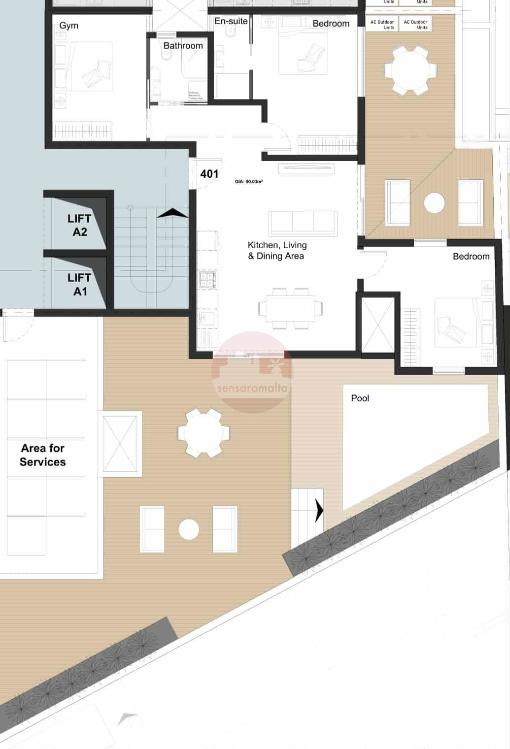 A 4th floor penthouse being sold on plan, measuring 90 sqm internally and enjoying a 127 sqm outdoor terraces with own private pool.
